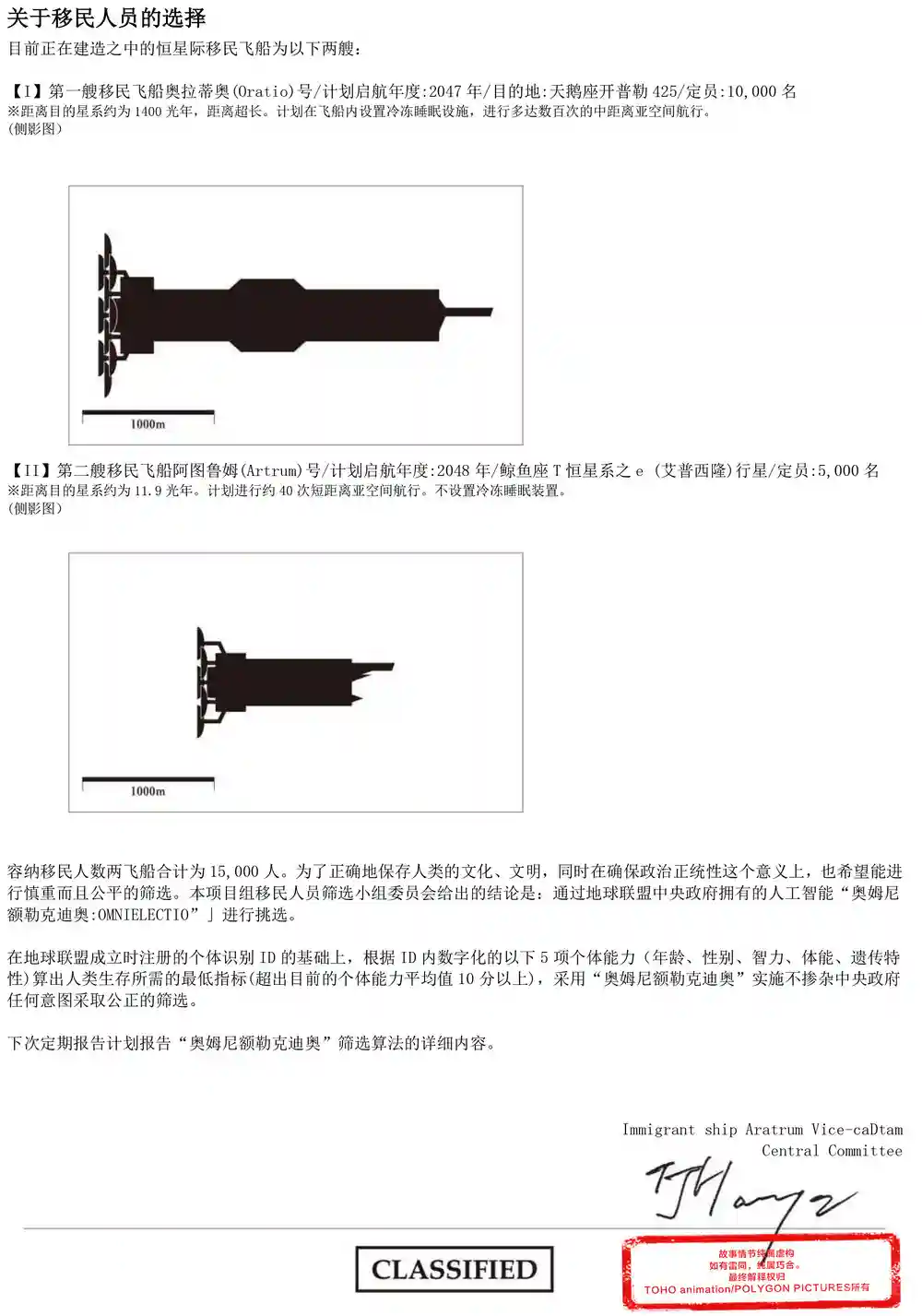 第一移民船奥拉蒂奥号(オラティオ)号,载人数10000人,目的地为白鸟座Kepler-452,这是NASA史上发现的与地球环境最接近的星球,有着地球2.0的别称,距离地球约1400光年。