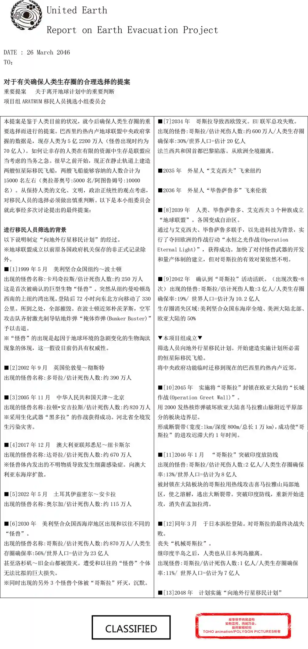 1999年5月开始,地球各处都开始出现巨大的怪兽,2042年哥斯拉频繁活动,地球人口也因此从70亿人激减至5亿2200万人。此时也有外星人加入到了地球人与怪兽中的战斗,艾克西夫人(エクシフ),有着自己宗教信仰的外星人;比鲁萨鲁多人,崇尚科学的外星人,在人类离开地球时,曾协助人类开发对哥斯拉决战兵器,但最终失败。