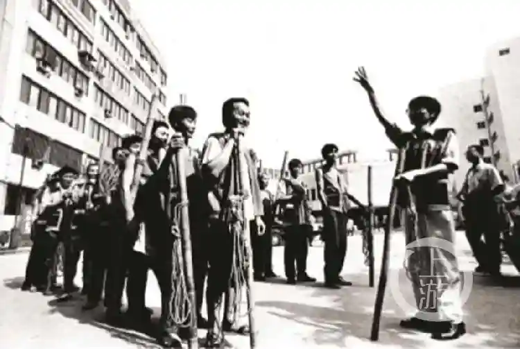 1998年7月15日,重庆市第一个由“棒棒”创办的劳务公司—棒棒军公司成立,“棒棒司令”刘晓萧在对他的“部队”训话。