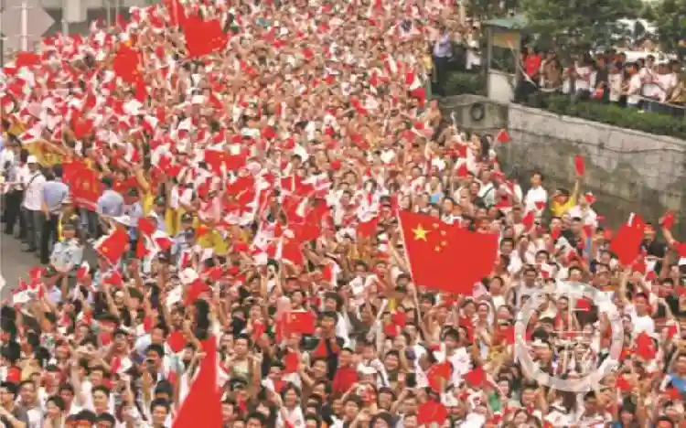 2008年8月8日,第29届奥运会将在北京举行,举国欢腾。图为2008年6月,北京奥运火炬传递到重庆,上万市民欣喜若狂迎接火炬。