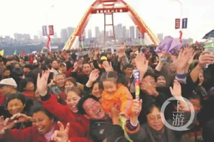 2007年10月,重庆市民群众热烈庆祝菜园坝长江大桥通车盛况。该桥是当时世界最大跨径公轨两用结构拱桥。