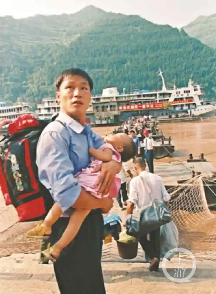 “舍小家,为国家,搬新家”,三峡外迁移民深情回眸祖祖辈辈生活过的地方。图为2000年8月13日,重庆云阳港。主人公叫余胜清,从云阳县南溪镇外迁至上海崇明岛。他背着背包、怀抱幼儿,五味杂陈的表情、稍显正式的穿着、充满留恋之情的眼神,被公认为三峡移民的典型形象瞬间和“移民精神”的真实写照。发表时题为《三峡外迁移民深情回眸》,登上过《人民画报》2001年年度封面,被誉为“国家记忆”。